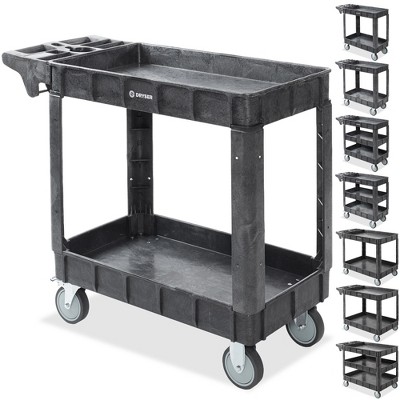 Superior Weight Capacity - The utility cart effortlessly handles heavy loads up to 550 lbs, including oversized cartons, large filing cabinets, and hefty toolboxes. Crafted from quality polypropylene material, it is corrosion-resistant, debris-proof, and easy to clean.Secure Lockable Swivel Wheels - Equipped with large 5-inch diameter swivel casters that support 360-degree flexible locking, two of the casters feature dependable brakes with quick-stop functionality for safe and stable transportation, especially on slopes and bends. Suitable for warehouses, garages, offices, gardeners, hotels, and various transportation needs.Functional & Versatile Handle - The service cart features a top-lipped shelf with a push handle that includes a built-in storage compartment. This design allows for optimal hand placement, safe control, reduced fatigue during operation, and additional storage space. The multipurpose handle offers easy access and can hold cups and other small items within reach.Enhanced Storage Options - The inclusion of side circular holes on the cart provides flexibility to attach accessories and hooks for small tools, simplifying the organization and storage of miscellaneous items.Easy Assembly - Assembling the rolling utility cart is a breeze with just three simple steps. Detailed instructions are included for quick and easy assembly within minutes.