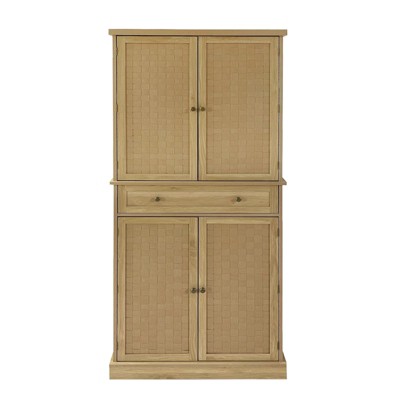 CuisinSmart 71'' Tall Rattan Coffee Bar Cabinet, Wood Kitchen Hutch Cabinet with 6 Hooks, 3 Drawers & 5 Doors, Rustic Pantry cabinet for Dining Room