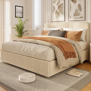 Feature:Comfortable Corduroy Bed Frame: Made from high-quality striped corduroy fabric, it is soft and smooth to the touch, creating a warm and comfortable bedroom atmosphere.Ample Storage Space: Built-in 4 spacious drawers provide ample storage space for the bedroom, allowing you to easily store clothes, bedding, and miscellaneous items, keeping the room neat and tidy.Durable and Sturdy Construction: Equipped with a sturdy wooden frame and a stable support system, ensuring long-term stable use of the bed frame, reliable load-bearing capacity, and safety and peace of mind.No Spring Box Needed & Noise-Free design: Features a slat support system without a spring box, combined with a silent design to effectively reduce friction noise, ensuring a quiet and comfortable sleeping environment.