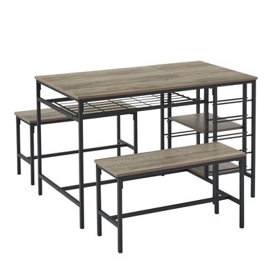 CuisinSmart Dining Table Set for 4 People, Kitchen Table with 2 Benches, Dining Room Table Set with Wine Rack, Brown, Black, Grey