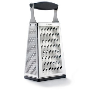 The Cuisipro 4-Sided Box Grater features five unique grating surfaces. Fine for citrus zest and Parmesan, coarse for most cheeses & vegetables, ultra coarse for soft cheeses, a slicer for vegetables, and a ginger grater. The science behind Surface Glide Technology is based in the repeated grooved pattern that is spread evenly across the face of the grating surface. The grooves provide 2 distinct benefits beyond other graters. First, the groove reduces resistance, making grating effortless. Second, the elongates groove shape lengthens each individual blade, so each blade has a greater cutting surface that comes in contact with food, therefore producing more gratings per stroke.