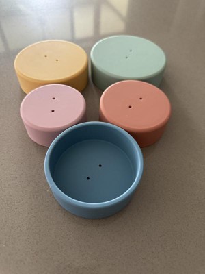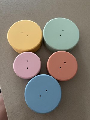 Set of 5 silicone stacking cups. These cups are easy to hold and with a flat surface, easy to stack. They have 2 small holes in the tops so they can be used in the bath as a fun toy too! Nice pastel colors.