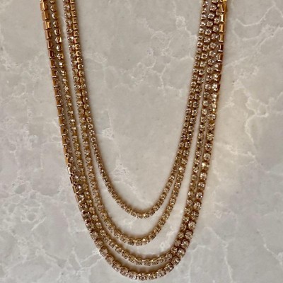 [This review was collected as part of a promotion.] This necklace is a beautiful statement piece for the price. I love the layered strands as it gives an elegant, luxurious look. It is perfect for dressy occasions, but it also can elevate a simple outfit. The gold tone and rhinestones catch the light nicely without looking too flashy or fake. It is a little bit heavier than I expected, but overall it is still a great necklace. I received an incentive to write this review.