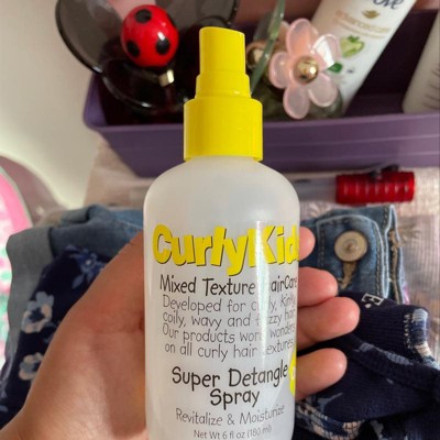 Curly Kids Super Detangling Spray gently detangles all curly hair textures. Incredible tangle-taming super detangler works wonders on mixed and multi-textured hair. The tangle-free formula reduces breakage and promotes healthy hair growth. Results are amazing and immediately noticeable when brush or comb glides through hair, reducing breakage and conditions for all curly hair textures. Maximum moisture and manageability without feeling sticky or greasy.
