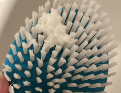 The texture of this reminds me of slime. The first time I used it I was surprised that it was opaque and so thick…it reminded me of Nickelodeon Gak from the 90s. I had to really work it to get it to a something soapy. It doesn’t really lather well. I applied it to a scrub brush and was surprised that it just settled on to the top of the bristles,, like a solid. Because it’s slime texture. And I was annoyed after I tried to scrub my back with it and it just settled down into the bristles but stayed in place…because it’s like slime, not body wash. This has never happened with any wash I’ve put on a brush before. The next time I got in the shower I tried again exactly as before, and took these pictures for reviewing. I can’t say if this really is effective for acne. I have sensitive skin and it doesn’t seem to make it worse necessarily, and doesn’t have any real scent which I appreciate. But I got this for bacne and it’s kind of hard trying to use a wash that’s this texture on one’s own back, when you really have to work it and it’s too much of a solid for easily using on a scrubber. I have to try to kind of lather it in my hands (it’s doesn’t really lather just kind of thins it out), then apply that to a brush as well as I can, and just hope it does something. I don’t think I would buy this again, it doesn’t seem like a miracle product, and it’s too thick and weird textured for me to find it practical.
