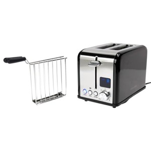 This 2-Slice Digital Toaster with Sandwich Cage offers six browning levels with dedicated Bagel, Defrost and Reheat functions, to make toast, using any bread. The LED digital display offers high visibility, and a countdown timer, so you know exactly when your food will be ready. Plus, with the included sandwich cage, you can make toasted sandwiches in minutes, and it is dishwasher safe for easy cleaning. Includes 13 recipes to get you creating yummy food, right out of the box!