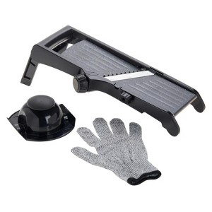 Easily set up this mandoline for either slices or julienne cuts. Simply adjust the back stand, rotate the blade and thickness knobs, and you're ready to start your meal preparation. The set comes with a handguard and cut-resistant glove to help you slice safely and easily.