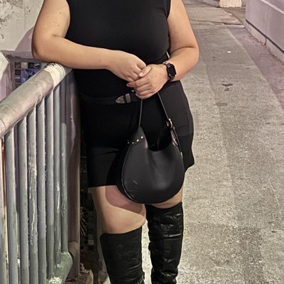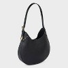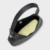 Take your essentials on the go in style with this Curved Shoulder Bag from Universal Thread™. Made from vinyl fabric, this unstructured tote bag features a curved upper with metallic button detailing on the sides for a chic, textured look that goes well with any of your outfits. Designed with a single compartment, this curved bag has a magnetic closure and single shoulder strap for easy carrying.