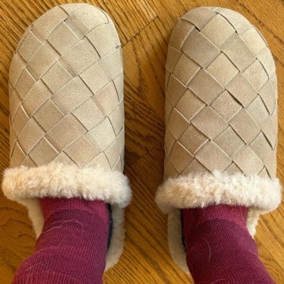 [This review was collected as part of a promotion.] I chose a 6.5 (my usual size is a 6-6.5) and I would say it fits true to size. The inside is fuzzy and gives a snug feeling. Since it is a clog, I prefer to wear this with socks to keep my heels warm, but the soft fuzz would still be enough cushion for bare feet. The bottom is very firm/stiff support. There is not a lot of give in the shoe, which makes it great for walking outside to the garage in or for a quick walk down the driveway to grab the newspaper or mail. I like the color being a soft beige. And while I would prefer one continuous piece of fabric on top, someone else might like the dimension of the cris-cross pattern. There is just the right amount of cushion and support, which is what I would say is the most important part of a shoe. There is also texture on the bottom so the slipper does not get too “slippery”. It runs a bit wide on me, though I do have narrow feet - I would still say the “M” width would work for a true medium to wide foot.