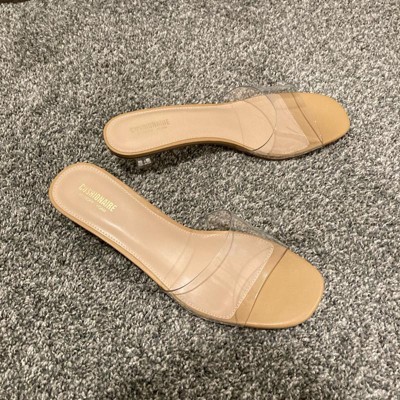 [This review was collected as part of a promotion.] These heels are cute and so in style! The clear portion of the heel is so cute. However, these do not fit my feet very well. The strap that goes across the top of the foot was too tight and I could not get my foot all the way in. Sizing up one size would probably be helpful, 10 is my normal shoe size.