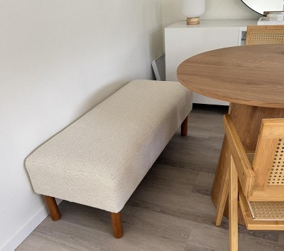 At first I thought it was too big for my space but I think it’ll work as 2 people can sit while eating on a round dining table. Really comfortable too as well. The legs are screw ons so very easy to assemble. Only complaint is it’s quite expensive. I only say that because I’ve had similar and they were almost half the price.
