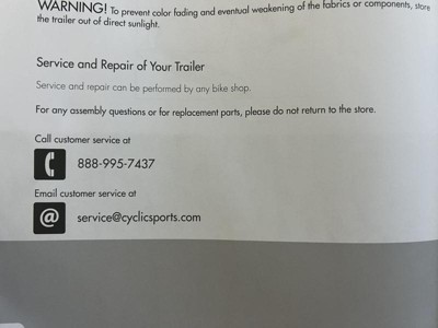 The bike trailer I received has a broken clip in the back. I tried emailing the manufacturer and I tried to contact them through their website to ask if I could get the clip replaced, but they won’t respond. I would not recommend buying anything from Cyclic.