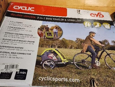 The Cyclic Double-Double is a two child trailer the can easily be configured for use with 1 or 2 kids, used as a cargo trailer or two tow pets! It features a unique single step folding cabin that can be easily collapsed for transportation or seasonal storage. This trailer also includes a complete conversion kit allowing it to be modified into a stroller with a front mount swivel wheel and push bar. Our unique venting systems with rear vent panels allows for maximum airflow reducing heat build up in the cabin. An oversized rear storage compartment allows for stowage of accessories. To improve the quality iof the ride this unit also features an integrated suspension system allowing for the smoothest ride! All around one of the best trailers in our line up and adaptable to all your needs.