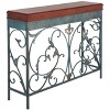Inspired by old English garden gates, the Ronald console has the charming characteristics of a country gentleman: solid and filled with character. With its elaborately tooled apron and dark brown birch wood top, it is at home in any room that needs Old World style.