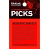 D'addario's Acoustic Variety pack consists of 13 assorted guitar picks in various materials, shapes, and thicknesses. Nylflex provides a warm sound, while Celluloid has a well-rounded tone. Gripped and wide-shaped picks offer extra control, and Light to Medium gauges provide flexibility while strumming. Try them all to find perfect acoustic sound.