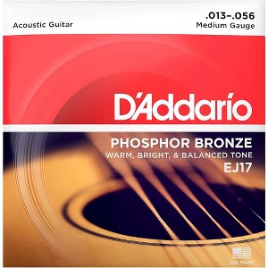 Gauges 13-17-26-35-45-56. Genuine phosphor bronze alloy retains flexibility as well as brilliant tone for many hours of hard play. The EJ17 acoustic guitar strings feature a computer-controlled wrapping around a hex core that ensures consistency and extends life. D'Addario is the world's largest manufacturer of strings for musical instruments. Many top guitarists won't play any other brand. Regardless of playing style, D'Addario has a string set that's right for .