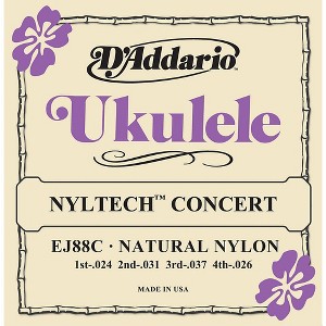 D'Addario EJ88C Nyltech Concert Ukulele string sets are designed for use with all concert ukuleles. Each string within this set is made from D'Addario's exclusive Nyltech material and optimized for standard GCEA tuning. Developed in cooperation with Aquila, D'Addario Nyltech strings are an exclusive combination of materials designed to deliver an optimal combination of warm, yet punchy tone, comfortable playability, precise intonation and tuning stability not found in other ukulele strings. Made in the USA for the highest quality and performance. Gauges: .024-.031-.037-.026
