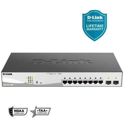The DGS-1210-10P supports 8 10/100/1000BASE-T PoE/PoE+ ports and 2 Gigabit SFP optical ports, with a total PoE power budget of 78W, underscoring D-Link's commitment to product quality with a Limited Lifetime warranty, ensuring long-term customer confidence.