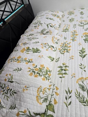[This review was collected as part of a promotion.] This quilt set is so feminine and beautiful! We have it on our daughter’s bed and we could not be happier with the quality, design, and feel. The quilt has good weight to it without being heavy, which is important, especially for our daughter because she overheats easily in her sleep. This fits our queen sized tall mattress beautifully and has plenty of fabric draped over the sides. The print is not blurry and the daffodils are such a sunny, cheerful flower design. The two shams are great as well, with cute little ties on the back to ensure a good fit and no pillow bulges through. My favorite detail is the scalloped edges and the yellow stripes on the reverse!