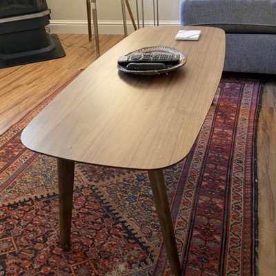 Such a beautiful table. I wanted a simple coffee table, walnut wood and without extra shelving underneath and this was perfect! A little higher than most coffee tables. Extremely study and so fast to put together.