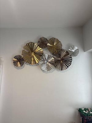 Add a romantic coastal look to any room with this modern fan metal wall art. Charming fan-inspired shapes congregate in an asymmetrical arrangement, adding to a delightfully edgy piece. From the Dahlia Studios brand of home decor, this hand-made wall art features an eye-catching blend of shiny silver, gold, and bronze finishes over open metal fan disc shapes.