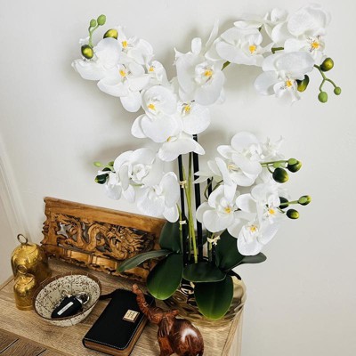 Dahlia Studios Potted Faux Artificial Flowers Realistic White Phalaenopsis Orchid in Gold Ceramic Pot Home Decoration 23" High