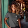 The Bow design adds a touch of charm and personality, tying everything together without saying a word. Upgrade your everyday wardrobe with our women’s jersey tee, designed to bring a balance of style and ease to your look. Featuring a classic crew neck, short sleeves, and a relaxed fit, this t-shirt offers a versatile and modern silhouette that effortlessly complements any outfit. Crafted from 100 percent Airlume cotton, the fabric feels incredibly soft, making it a go-to choice for all-day wear, whether you're on the move or relaxing at home. This jersey tee is perfect for a range of activities, from casual outings and running errands to layering under a blazer for a polished yet comfortable vibe. The breathable fabric ensures you stay cool during summer walks, while the relaxed fit offers freedom of movement for yoga sessions or light workouts. It pairs beautifully with your favorite jeans for brunch with friends, adds a laid-back charm to evening strolls, and works as a cozy option for travel days." Womens adult fit. Comes in color: Asphalt. Size X-Small