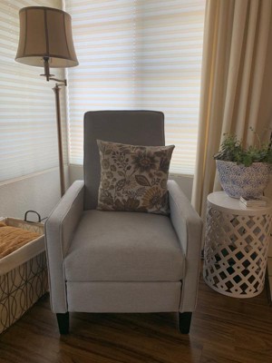 Cannot believe that I finally found a recliner for my little room with a tiny door. The recliner is comfortable, and easy to put together. I attached a photo with the area rug from target and the teal cabinet is also a target treasure. A big thank you to the buyers for target. Your finds are amazing.