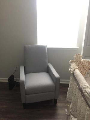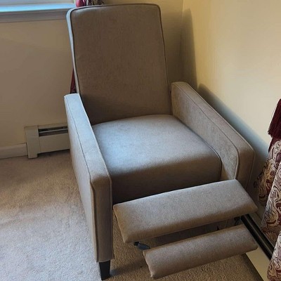 We purchased this recliner online bc we could tell it looked smaller than most recliners. Our baby room is pretty small so it fits perfectly in there. The fabric isn’t really nice. Doesn’t look cheaply made at all (a worry of ours). Easy installation for my husband. The only thing we’re not a fan of is that when you recline all the way, you have to push back so you don’t pop up. My husband doesn’t have an issue being 190 lbs but I do bc I dont weigh as much. Still worth the money though!