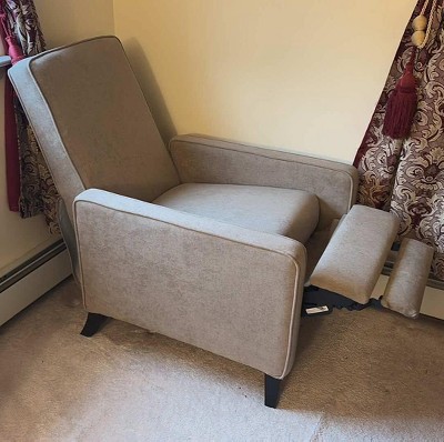 Smaller version of a recliner which I needed for my room size. Did not realize I needed to assemble it upon receipt, but I was able to without any issues. Wish the foot area would rise at little more for my feet. Requires strong push for in or out position. Probably not good for an elderly person.