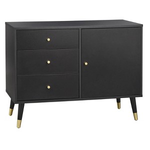 Mid-century modern sets the tone with the Dalton Buffet from Buylateral. Stylishly hip this buffet features three drawers and a large cabinet for storing all your dining room and entertaining essentials. The perfect addition to your space in a striking black finish. This cabinet will complete your room décor providing everything you need within arm’s reach.