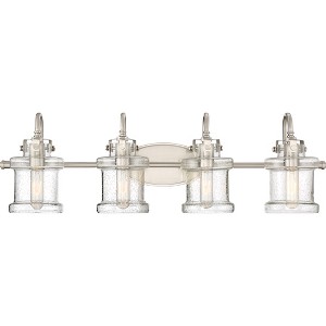 Traditional in design yet transitional in execution, the Danbury bath collection features clear seedy glass with a unique jar-like silhouette. The decoratively capped center rod supports gooseneck arms that secure the vintage-inspired shades with exposed latches. The versatility of the collection is further defined by its lustrous polished chrome, brushed nickel, or earth black finishes - all available in a variety of size options. Install with shades facing up or downwards to further customize to your desired vanity setting.