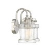 Traditional in design yet transitional in execution, the Danbury bath collection features clear seedy glass with a unique jar-like silhouette. The decoratively capped center rod supports gooseneck arms that secure the vintage-inspired shades with exposed latches. The versatility of the collection is further defined by its lustrous polished chrome, brushed nickel, or earth black finishes - all available in a variety of size options. Install with shades facing up or downwards to further customize to your desired vanity setting.