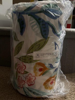 The Levtex Home Danika Comforter Set is 100% cotton front and back with soft polyester fill. The face showcases bold florals in shades of red, orange, green, and blue, reversing to a smaller coordinating geometric pattern. Machine washable for easy care.