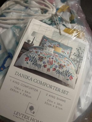 - THE DANIKA COMFORTER SET: A bold botanical pattern with large florals in vivid red, orange, green, and blue, together with matching shams. This set is part of the Levtex Home Danika collection. Used by itself, layered with other pieces, or as the centerpiece of your bed, it is extremely versatile.