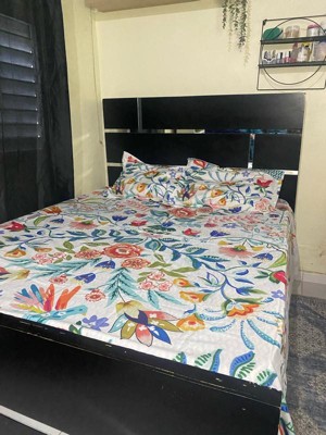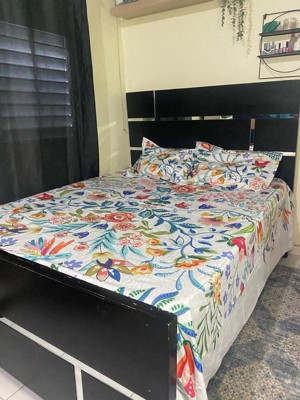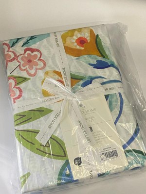 The Levtex Home Danika Duvet Set is 100% cotton front and back. A bold botanical print with florals in red, orange, green, and blue reverses to a smaller coordinating geometric pattern. Finished with a button closure, this set is machine washable for easy care. Insert not included.