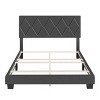 This unique, fully-upholstered bed with diamond-stitched detail on the headboard will be the statement piece in any bedroom. Headboard features elegantly-tufted diamond shapes with contrast stitching. Support system consists of 6 perimeter legs, 4 cross beams plus center support legs that easily support up to 700 lbs. You will need a box spring or foundation with this bed frame. This bed ships in 1 box for easy transport and is backed by a 1 Year Warranty.