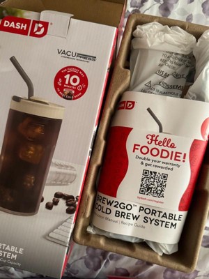 - Includes: Dash Brew2Go™ Portable Cold Brew System, Silicone Straw, Precision Scoop, Cleaning Brush, USB Charging Cord, and Recipe Guide