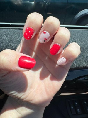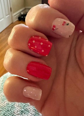 Love the red in this set and I love polka dots!! I specifically ordered 2 sets just so I can use the solid red and the polka dots on both my hands and feet. I wish there was a set that was entirely polka dot. The strips with the little cherries are cute and I will probably do another manicure with the solid red pieces and the cherries but I don’t like light/pastel colors and the remaining pieces might not get used by me.