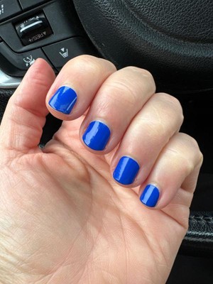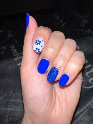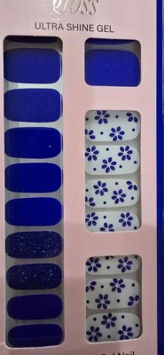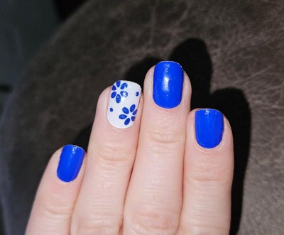 Very clasé. Royal blue & white gel nail strips featuring blue glitter and floral accents with a glossy, high-shine finish. Gel nail strips made with 100% real gel! Flexible, lightweight, and equivalent to 1 layer of salon gel. No light needed!
