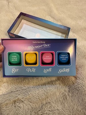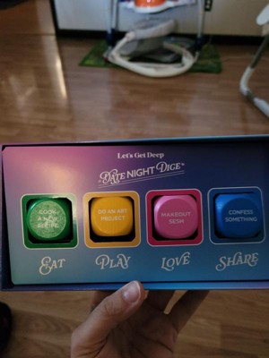 [This review was collected as part of a promotion.] This is a great gift for a couple to switch things up! You can decide how many dice you want to roll based on what you’re feeling (food, doing something non-food related, intimacy, or sharing). It can help switch things up and build connection. For example, the share dice has “share why you appreciate them” which could start a meaningful conversation or if you’re looking to do something different, you can roll the play dice and get different ideas like “playing a game”, “dancing together”, etc.