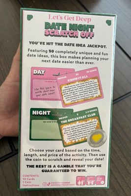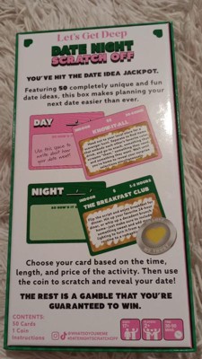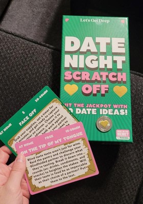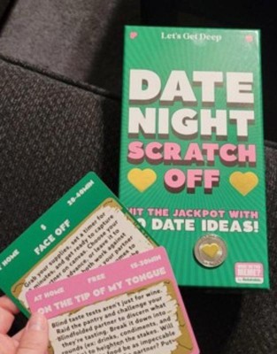 [This review was collected as part of a promotion.] The Date Night Scratch Off package is an interesting game that will give some ideas for dates. Some of them are corny, but also fun to attempt. You select a card and scratch off to reveal your date challenge. There is also a section on the back to write down how the date went. They have a price range, if it's indoors or outdoor, and how long the date might take you at the top of each card so it makes selecting one that fits your timeframe and budget a little easier before scratching the card.