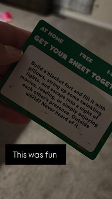[This review was collected as part of a promotion.] This product is so fun!! I played it with my boyfriend and we enjoyed it so much. Once we decided what kind of activity we wanted to do. we scratched it off and we did it! sometimes our date nights can get kind of boring but this game made our latest one so fun! We will definitely be using this one all future date nights!!