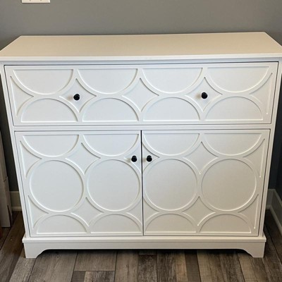 The Dawson Circle Front Buffet Cabinet from Buylateral adds the perfect touch of tasteful elegance to your dining space. Decorated front panels feature a circular pattern which adds interest creating a subtle focal point in any room. The top drawer is ideal for organizing linens and cutlery while the lower cabinet with an adjustable shelf is perfect for storing serving pieces, glassware and more.