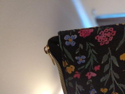 - Durable zipper is gold with a vegan leather finger loop for carrying