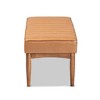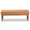 Give your dining room a refreshing update with the rich comfort and classic design of the Daymond dining bench. Made in Malaysia, this walnut brown finished wood bench complements any room layout. The Daymond is padded with plush foam and upholstered in tan faux leather for smooth comfort with every meal. Requiring assembly, the Daymond features sleek channel tufting for a contemporary look. Angled, tapered legs create a charming silhouette inspired by mid-century design. An excellent addition to smaller dining rooms and nooks, the Daymond dining bench brings a cool, laidback atmosphere to any space. Dimensions: 17.3" High x 47" Wide x 17.7" Deep; Seating Dimensions: 17.3" High x 47" Wide x 17.7" Deep; Legs: 11.4" High;