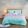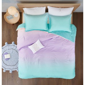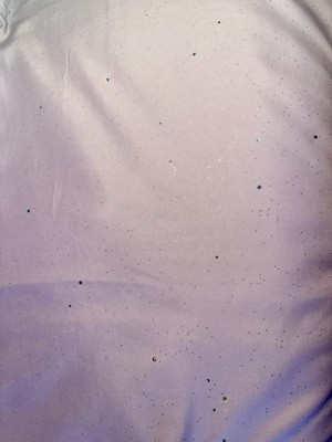 The Mi Zone Dazzle Metallic Glitter Printed Reversible Comforter Set brings a lively and colorful update to your bedroom. This ultra-soft reversible comforter features an ombre pattern of vibrant hues that flips to a solid color on the reverse. Matching shams (1 for Twin Sizes) come in a variety of colors that coordinate with the comforter, while brilliant sparkles and glitter adorn the contemporary comforter set all-over, creating fun and magical look. An oblong pillow provides the perfect finishing touch to complete the comforter set. Machine washable for easy care, this printed reversible ombre comforter set is sure to brighten your bedroom with a whimsical flair. Sham varieties include aqua, blush, and pastel purple colors; only 1 color variety in each bedding set. This bedding set also uses an antimicrobial treatment that provides built-in freshness protection, reducing the growth of odor causing bacteria to keep fabric lasting longer. Items in the set may come in a rolled or compressed packaging, which will need to be fluffed up or steam ironed before use to remove wrinkles.