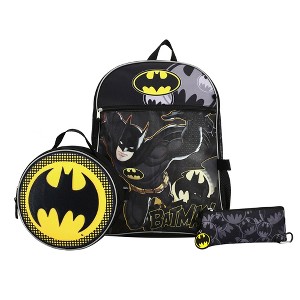 5-PIECE SET: The DC comic book superhero Batman symbol bag set includes an adjustable backpack, insulated lunch box, carabiner, rubber molded keychain and utility bag!