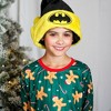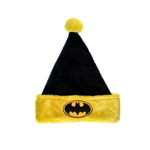 Elevate your holiday look with this beautiful Christmas hat featuring the Batman logo. Beautiful applique and embroidered materials in bright vibrant colors. A must have for Batman fans. Hat made of Polyester. 16" size perfect for anyone on your list, or keep it for yourself. High quality materials and construction.