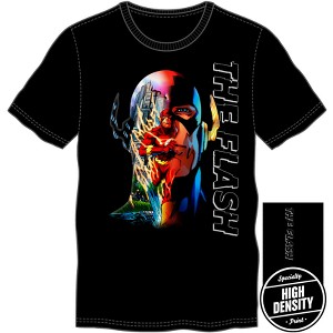 If you're not moving, you're not living. In this stylish DC Comics tee, you'll be ready to move at light speed. Features running Flash superimposed on a bold and vibrant closeup face design on a contrast black t-shirt. Comfortable and durable t-shirt that's 100% cotton.